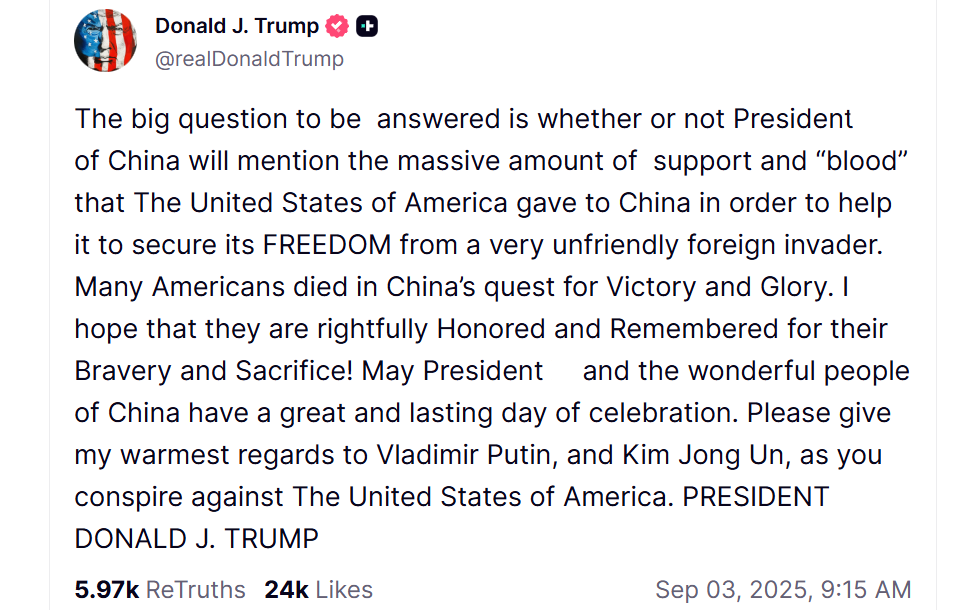 所以他一定很感兴趣中国阅兵什么样的,只不过里面也少不了酸言酸语,像是提醒中国别忘了当年美国给予的“巨大支持”和“牺牲”,要中国铭记美国英雄