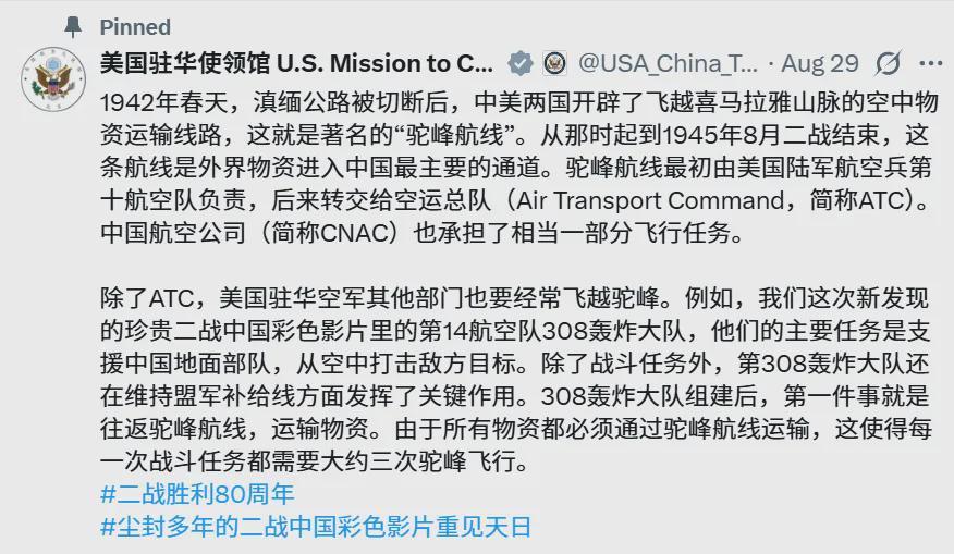 在美国驻华大使馆的推特,也特意将这条文章置顶,吸引大家注意,这是讲二战时中美驼峰航线,美国援助中国的一系列行动,配合特朗普要中国别忘了美国人